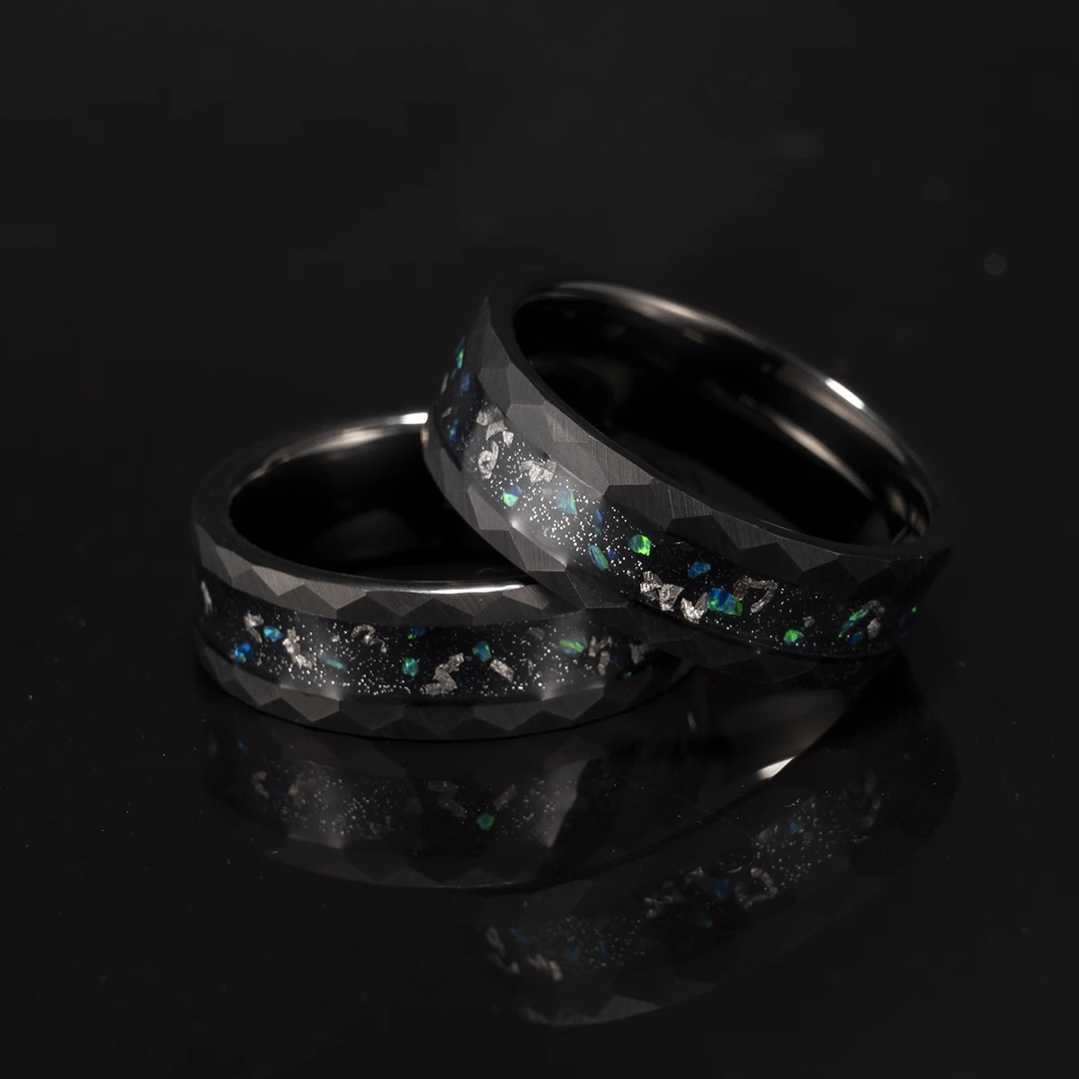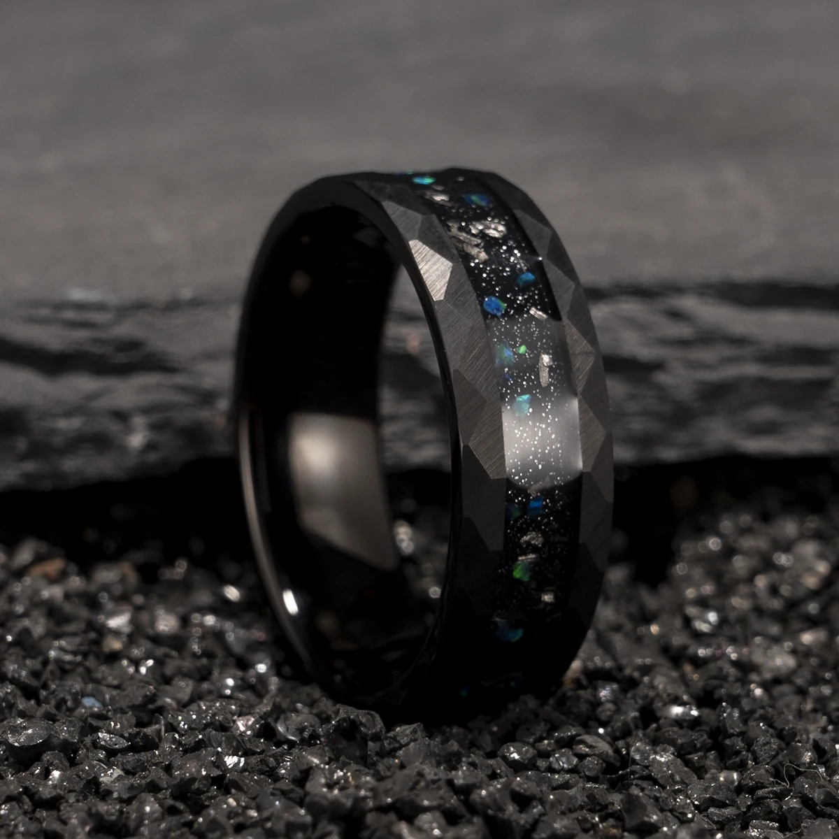 8mm Tungsten Carbide Crushed Green Opal Ring, Black Hammered Men’s Wedding Band, Daily Wear Party Wedding Comfortable Fit
